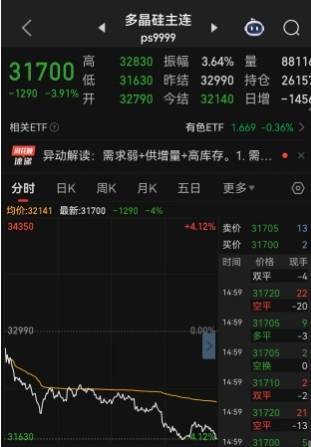 不过与A股的乌龙走势相比,期货市场对此次减产的小作文似乎“置之不理”。今日早盘,多晶硅期货主力合约低开后一路震荡下行,截止收盘下跌3.91%,报31700元/吨。